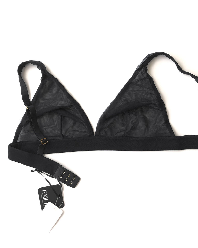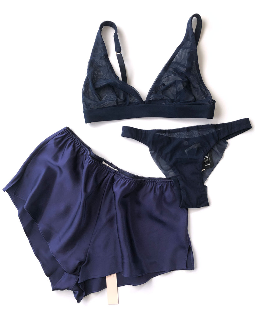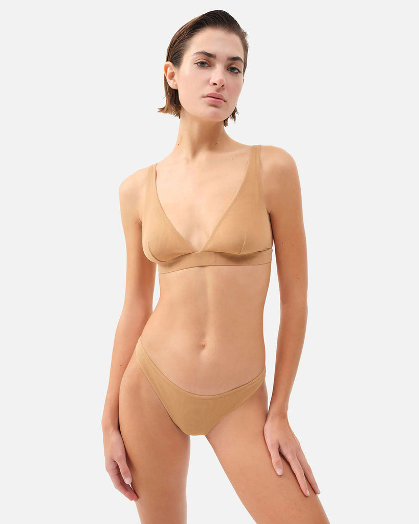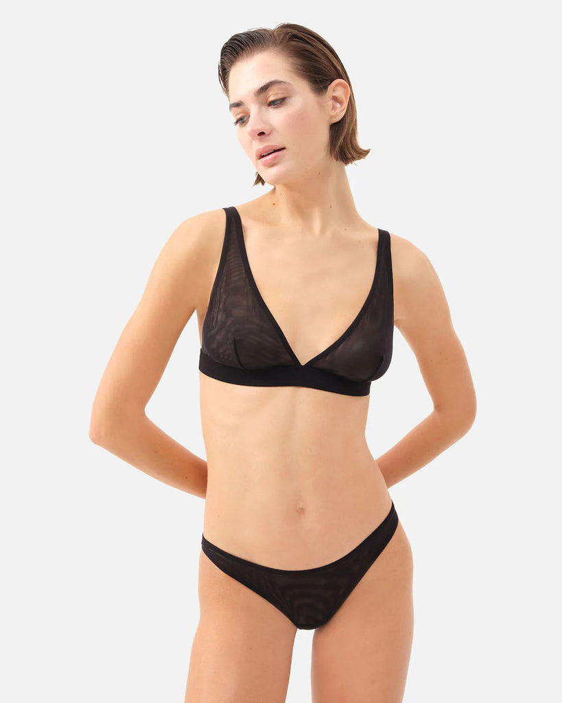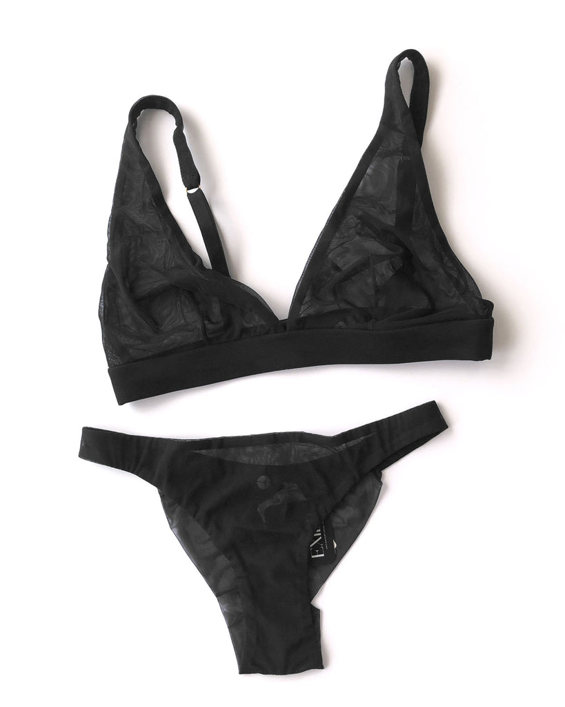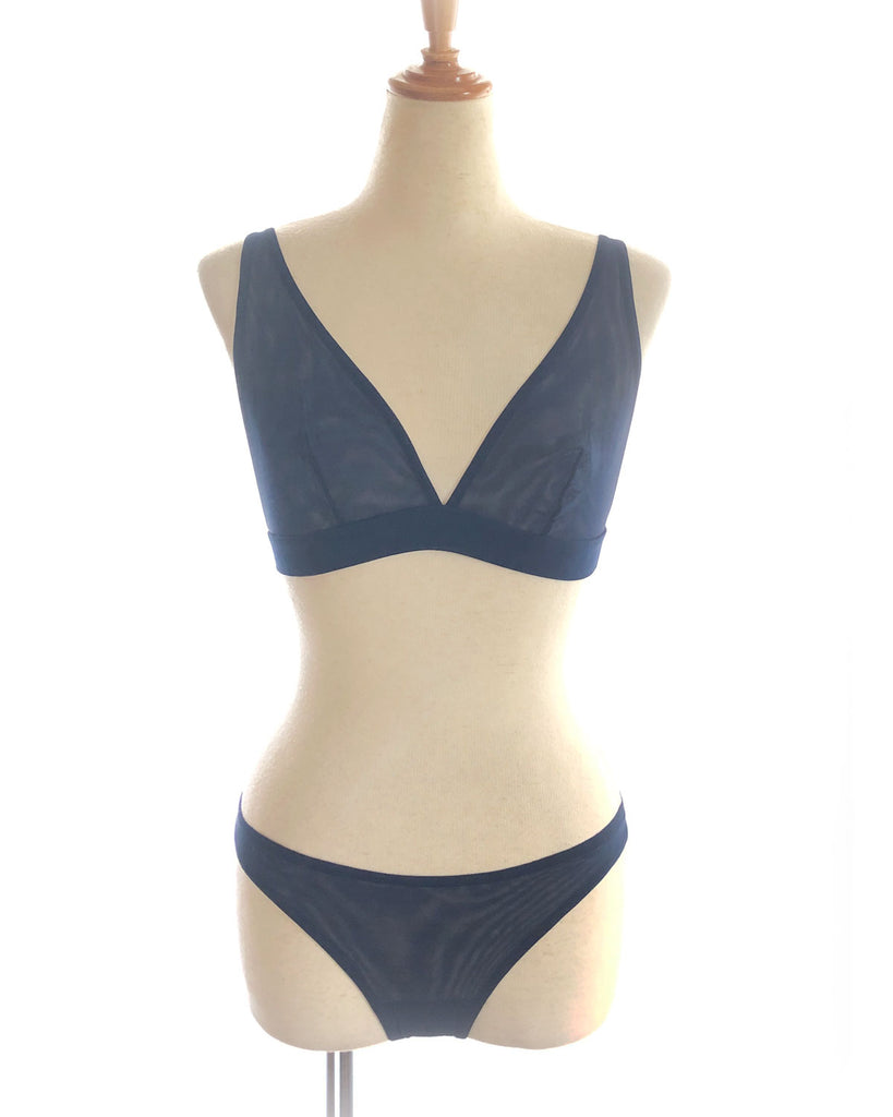 上質でソフトなイタリア製チュールの気持ちよさを存分に味わっていただける、トライアングルブラ&ブラジリアンショーツのセットアップ。