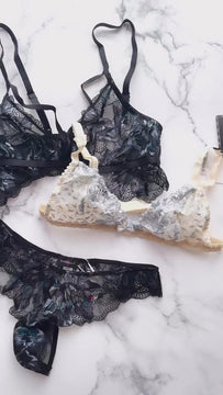 ブラック ブラレット&ソング:ブラックレースに、ブルーの糸が密やかに光をたたえます。ウェスト〜ヒップのカーブを美しくみせ、デコルテを魅惑的に演出するデザイン。バストはノンワイヤーですが、バストのホールド感はきちんとあり1日快適にお召しいただけます。ひらりとヒップにレースが広がるソングは、エアリーな履き心地です。