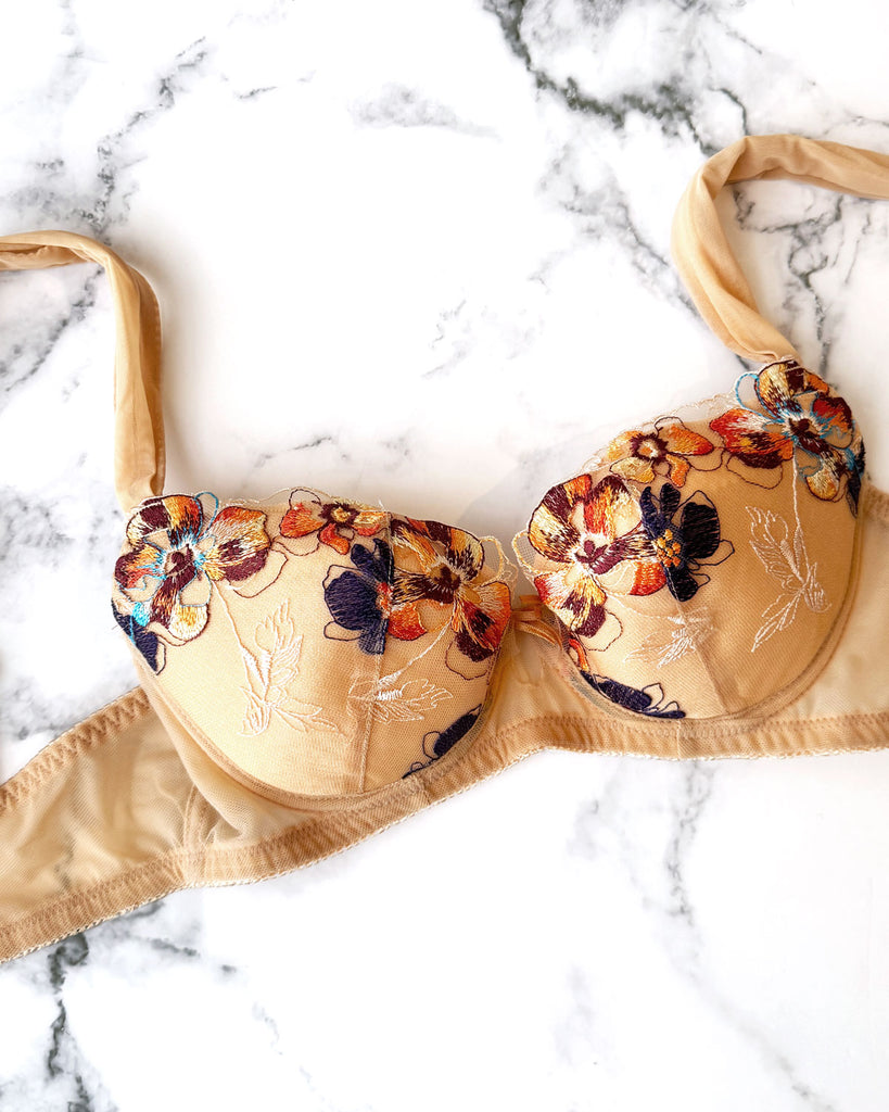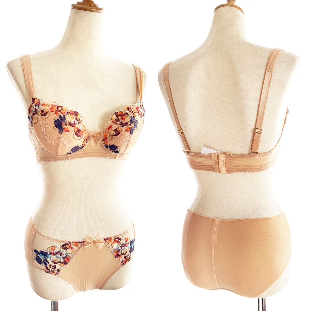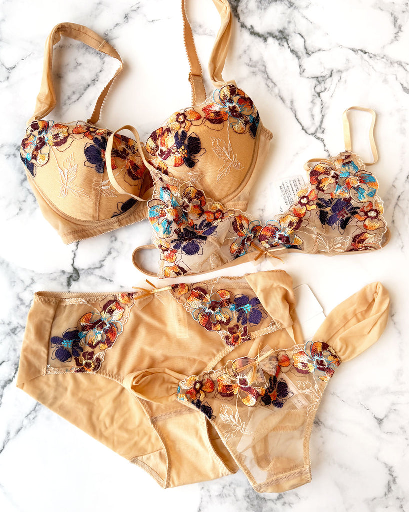 ヌーディーなメッシュに鮮やかな刺繍をほどこしたレースが目を惹く”ERIN”。