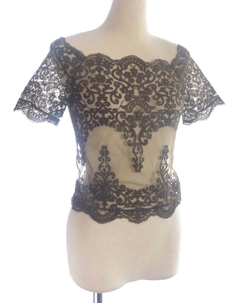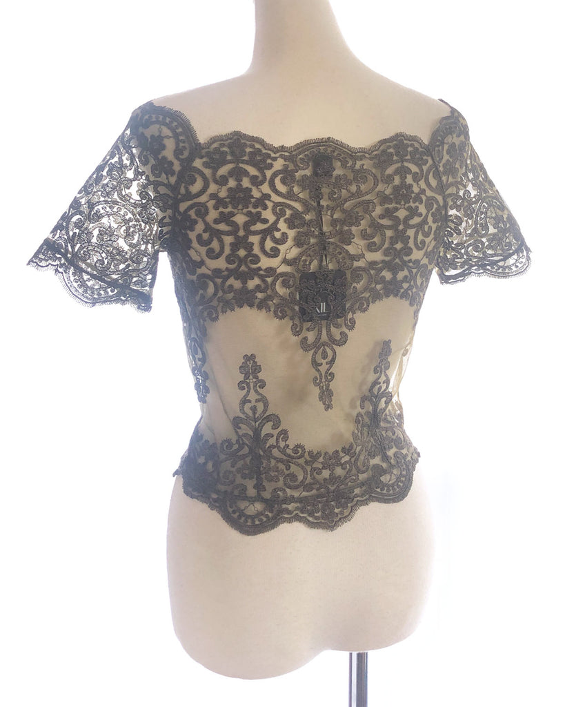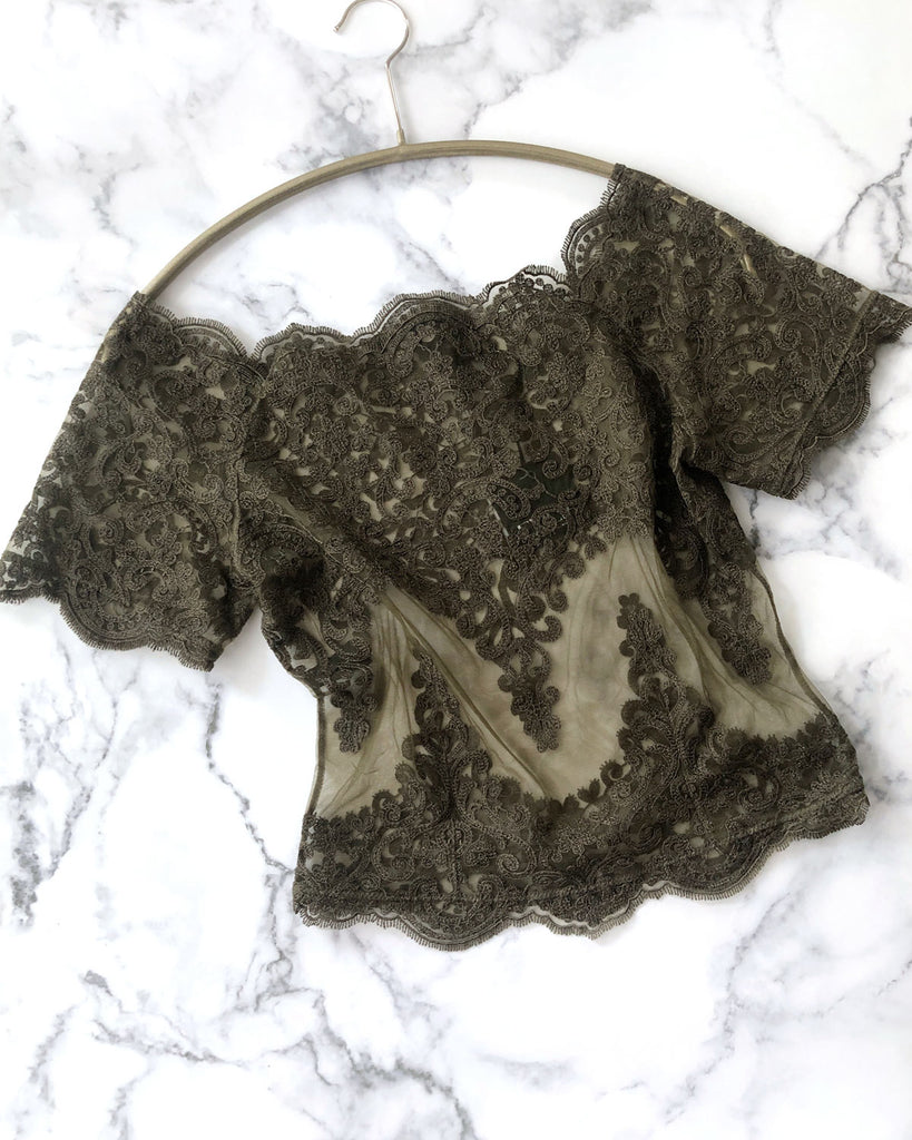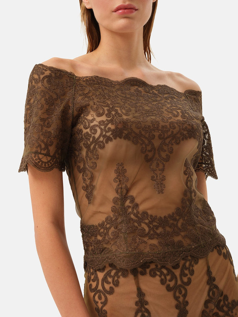 彫刻のようなレースを贅沢に使った、オフショルダーのレーストップ。